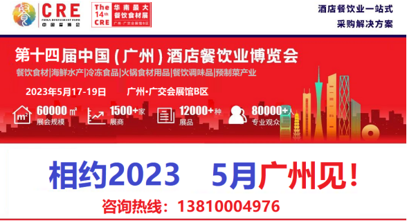 中国酒店餐饮业博览会(简称:CRE中国餐博会)是国内规模最大、影响力最强、品质最高的酒店餐饮博览会之一。将于2023年5月17-19日,广州·广交会展馆B区盛大举办!由广东省餐饮服务行业协会与广东省团餐配送行业协会共同主办。本届展会规模达6,0000㎡、预计吸引8,0000+专业观众、1500+知名品牌、有1,2000种产品展示、30+场同期论坛赛事活动。CRE中国餐博会整合餐饮全产业链优势资源,将大力推动餐饮业上中下游,迎合中国酒店餐饮业高速增长、满足业界不同领域业务需求而打造的全产业链、全渠道整合、高效交流平台,聚力打造2023华南餐饮业年度盛会,共同开拓中国餐饮业市场蓝海,为全国餐饮业发展注入强劲新动能!