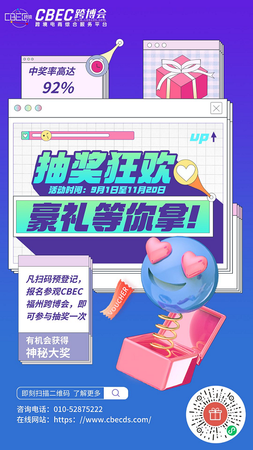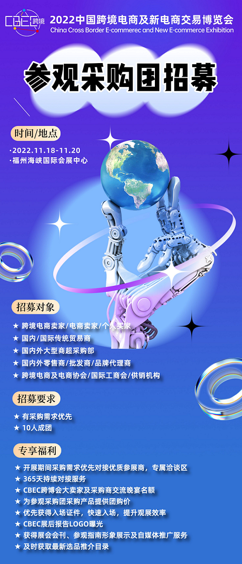 CBEC跨博会将于2022年11月18-20日在福州海峡国际会展中心举行。本届展会以“跨境电商迎来利好,中国制造惠及世界”为主题,“践行新发展理念,谱写合作新篇章”为指导思想。展会面积达45000平方米,将有1500+企业、800+供应商、500+SKU、30000+专业观众到场,更有100+亿级采购需求现场发布。
