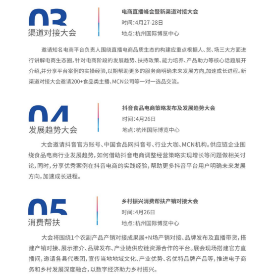 本届展会将同期举办7场论坛活动,邀请资深行业专家、品牌企业领袖、行业协会代表等,聚焦食品电商与新电商及新零售新消费等热点领域,从政策环境、行业趋势、跨界机遇等多个维度,展现电商行业监管逐步加强的新形势下直播行业的新视角新价值,探寻抢抓发展新格局新机遇。