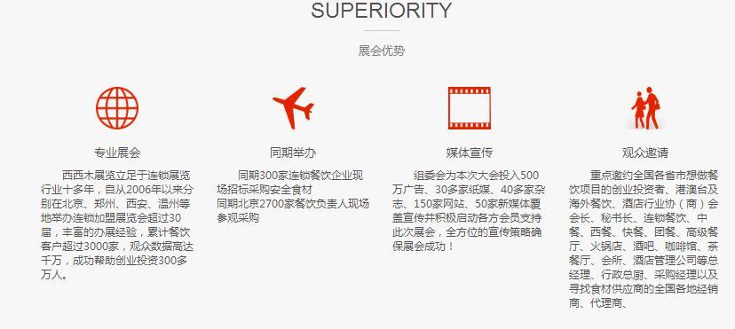 北京连锁加盟展往届回顾: 大会展出面积15000平米,参展单位320个,展出连锁品牌360个,展前邀约专业观众20000人,安检记录53600人次。本次参展连锁品牌项目涉及餐饮、教育、环保、家居、电子、洗衣、健康保健、食品小吃、服饰连锁、儿童主题乐园等13个行业,本次展会吸引了不少行业知名龙头企业前来参展。北京连锁加盟展展会优势:强大媒体宣传:24家报纸媒体、19家杂志、126家网站覆盖宣传,并积极启动各方会员支持此次展会,全方位的宣传策略确保展会成功!