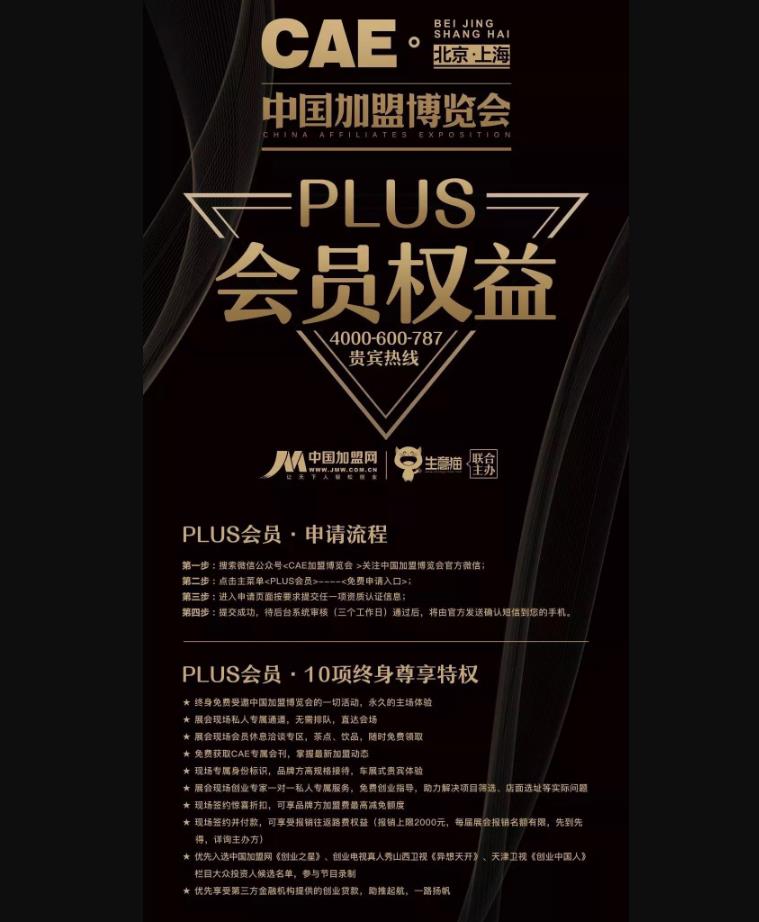 中国加盟网旗下CAE中国加盟博览会在第13届中国加盟博览会首创行业 “PLUS会员”参展制,将PLUS会员与普通观众进行区分。成为中国加盟博览会PLUS会员将进行包括经济实力、信用证明、管理经验、经营经验以及准创业者5大维度的严格审核。中国加盟博览会为品牌严格筛选匹配观众,达到精准中的精准。