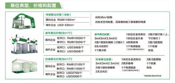 3mX3mX2.5m(H)、2组/1组标准楣板、2支日光灯、1张铝合金咨询台、2把折叠椅、1个电源插座(220V限500W内)、2面/3面围板、1个纸篓、地毯