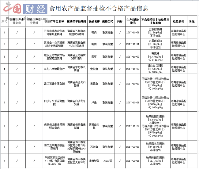 3月15日,海南省食药监局发布了一则公告。公告称,近期,该局组织抽检食用农产品、食糖、保健食品三类产品126批次,抽样检验项目合格样品117批次,不合格样品9批次。