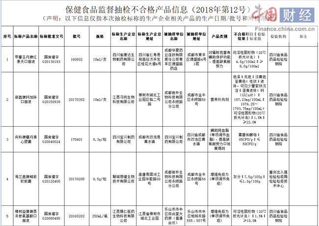 3月15日,四川省食药监局发布了一则公告。公告称,近期该局组织抽检了保健食品,主要包括增强免疫力、辅助降血压、缓解体力疲劳、改善营养性贫血、减肥、改善睡眠等功能类别和营养剂类。共抽检157家保健食品生产经营企业的288批次样品,其中合格产品278批次,不合格产品10批次。