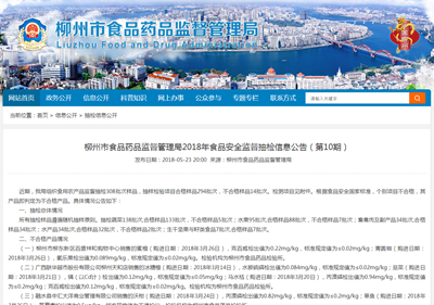 5月23日,柳州市食药监局官网发布公告称,近期,该局组织食用农产品监督抽检308批次样品,抽样检验项目合格样品294批次,不合格样品14批次。根据食品安全国家标准,个别项目不合格,其产品即判定为不合格产品。