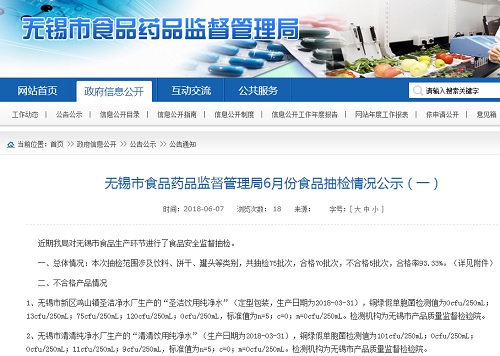 2、无锡市清清纯净水厂生产的“清清饮用纯净水”(生产日期为2018-03-31),铜绿假单胞菌检测值为101cfu/250mL;0cfu/250mL;0cfu/250mL;11cfu/250mL;9cfu/250mL,标准值为n=5;c=0;m=0cfu/250mL。检测机构为无锡市产品质量监督检验院。