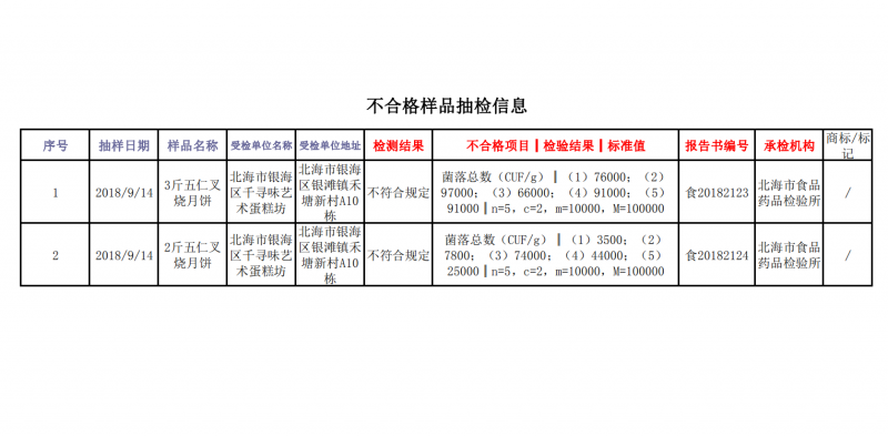 9月21日,北海市食药监局官网发布抽检信息公告称,根据《北海市2018年月饼生产质量安全专项整治工作方案》部署,北海市食品药品监督管理局对全市获证月饼生产企业进行了全覆盖抽检。