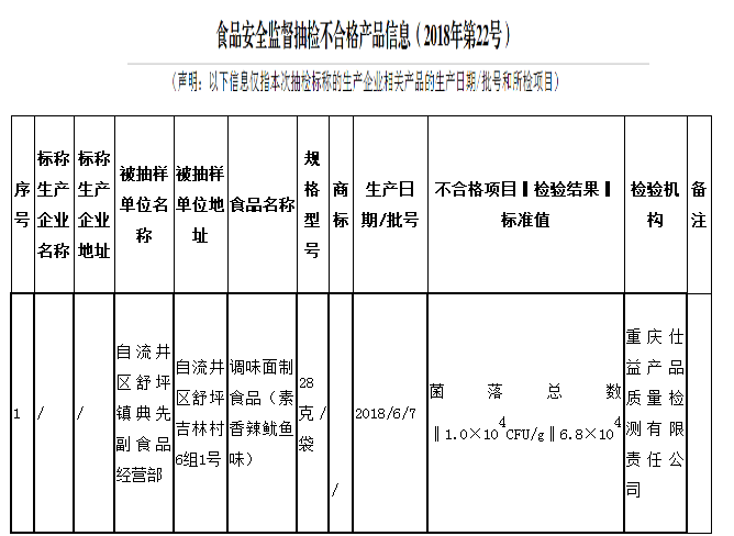 9月28日,自贡市食药监局官网发布抽检信息公告称,依据《中华人民共和国食品安全法》有关规定,近期该局组织抽检肉制品、糕点等九类食品共计24批次样品。其中,抽样检验项目合格样品23批次,不合格样品1批次。