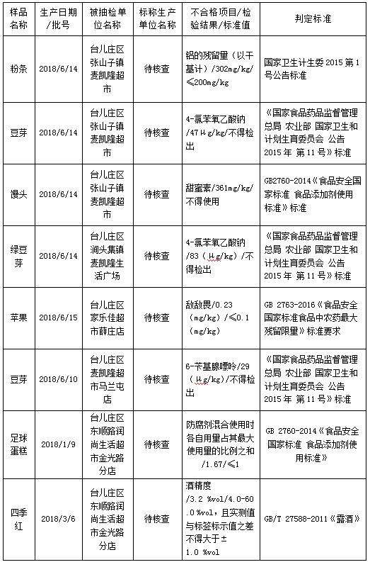 不合格食品包括粉条、豆芽、馒头、绿豆芽、苹果、足球蛋糕、四季红等。