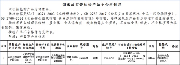 安徽邦厨食品有限公司生产的鸡精(调味料)(生产日期/批号:2018/8/15),检出谷氨酸钠21.3g/100g,标准规定谷氨酸钠≥35.0g/100g;菌落总数为11000cfu/g,标准规定为≤10000cfu/g 。检验机构为阜阳市食品药品检验检测中心;