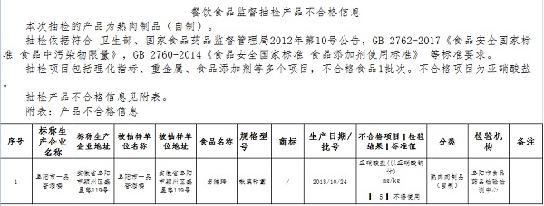 阜阳市一品香酒楼制作的餐饮食品卤猪蹄(生产日期/批号:2018/10/24),检出亚硝酸盐(以亚硝酸钠计)5mg/kg,标准规定为不得使用。检验机构为阜阳市食品药品检验检测中心;