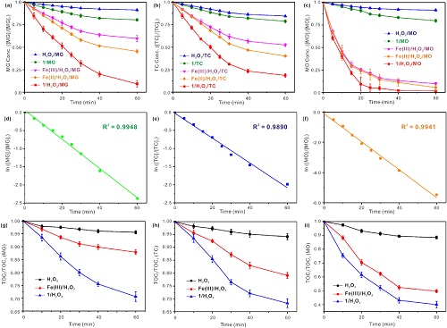 图1. 不同反应体系对目标污染物的降解效率和矿化程度比较。