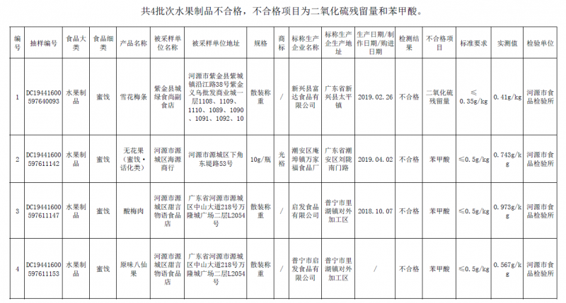 此次监督抽检4批次水果制品二氧化硫残留量和苯甲酸项目超过限量指标。