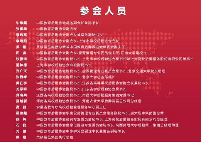 中国教育后勤协会常务副会长兼秘书长牛维麟、副会长张柳华、副会长兼常务副秘书长黎玖高,副会长兼上海市学校后勤协会会长李瑞阳,灵硕展览集团总裁兼中国教育后勤展览会组委会副主任吴鹏,中国教育后勤协会副会长、能源管理专业委员会主任兼江南大学副校长田备等领导出席,同时参与本次新闻发布会的还有30余所学校领导、20余家新闻媒体朋友。新闻发布会由中国教育后勤协会副会长张柳华主持。