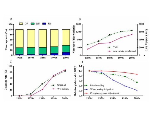 研究团队通过多年的大样本品种比较、田间定位监测、区域调研和历史数据挖掘,综合评价了近50年来我国品种更新、栽培创新和稻作制调整等对水稻产量和稻田温室气体排放的影响。
