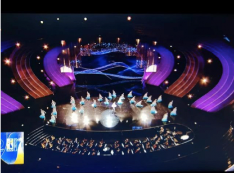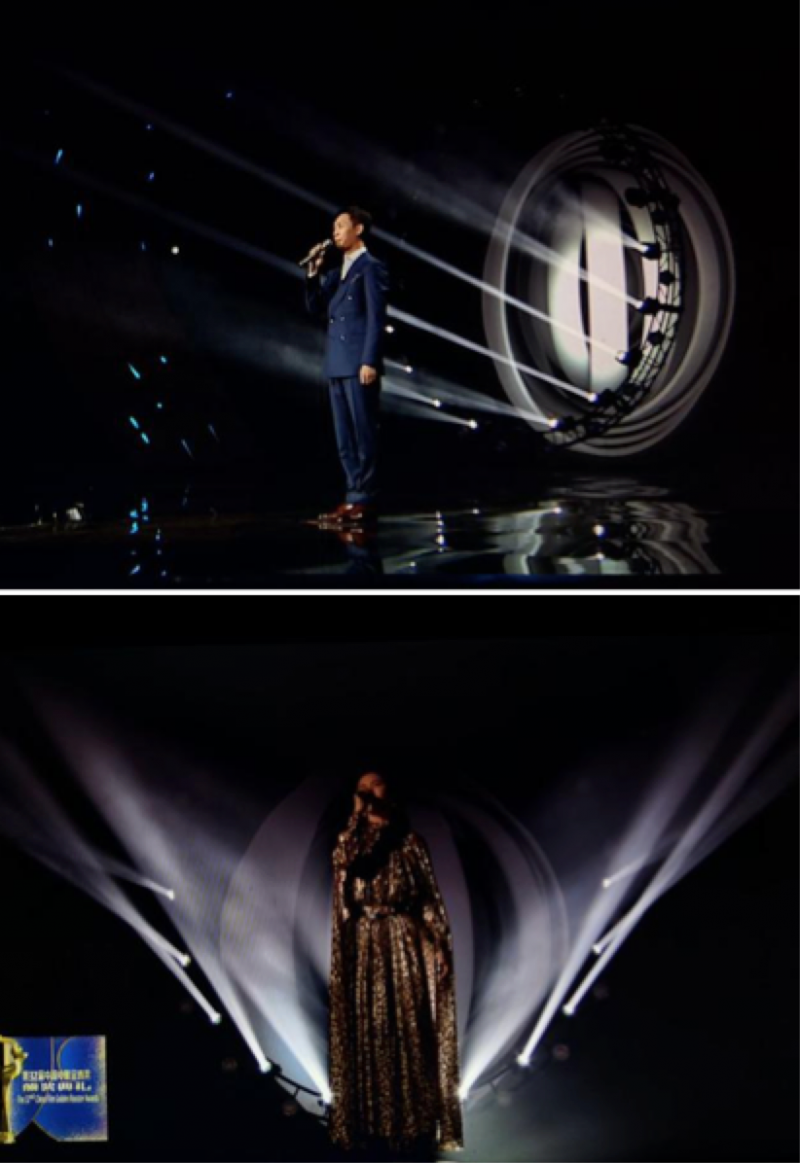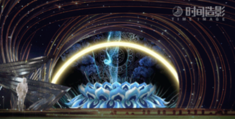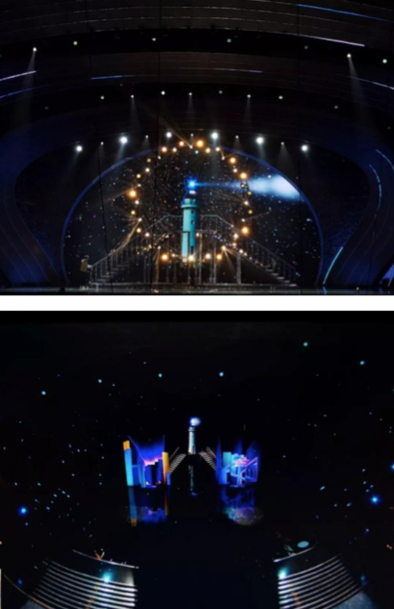 电影《攀登者》主题曲,将舞台整个营造了一个现代视觉艺术装置,屏幕用视频打造了一个球形的结构装置,灯光配合视频呈现以圆形的灯光结构,二者结合,形成了融为一体的艺术装置。歌曲宏大且正能量,9块冰屏共同组成了具有电影感片场的剪影,在球形装置上做了剪辑画面,电影幕后各工种忙碌的真实工作状态,致敬幕后电影人。