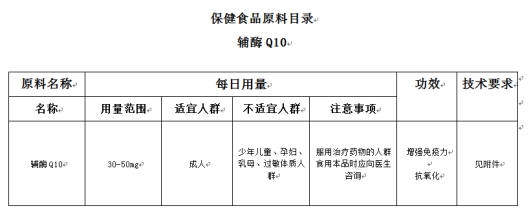 《通知》指出,含辅酶Q10的产品,其辅酶Q10的每日推荐食用量不得超过50mg。我国已批准的辅酶Q10保健食品(增强免疫力、抗氧化保健功能)每日用量范围是10-50mg。关于公开征求辅酶Q10等5种保健食品原料目录意见的公告》明确,辅酶Q10用量范围为每日30-50mg。