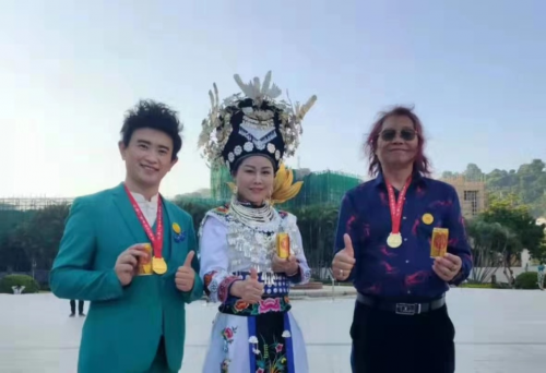 (王帅(左),楷雯 (中) 与王葆森先生(右)在澳门金莲花广场均喜捧大佬、竖起大姆指,盛赞大佬神奇植物解酒饮料)
