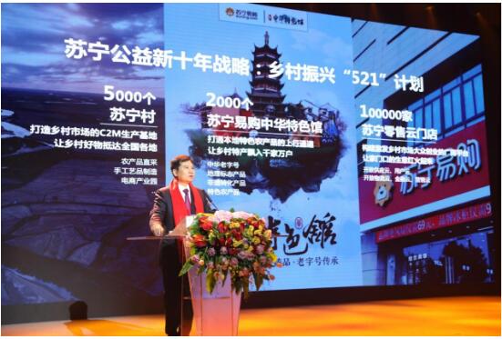 就在12月26日举行的“苏宁29 周年公益庆生仪式暨新十年公益战略发布会”上,苏宁控股集团董事长张近东发布了苏宁乡村振兴“521计划”。未来十年,苏宁将在乡村地区布局5000个苏宁村、2000个县级苏宁易购中华特色馆、10万家苏宁零售云门店。苏宁控股集团董事长张近东表示,“作为国家扶贫事业的承接和转型升级,未来,乡村振兴就是苏宁公益的重点所在,是苏宁致力于小康社会建设的重要领域。”