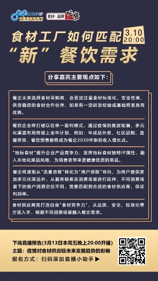 3月10日20:00,我们重磅邀请到蒸菜龙头企业“蒸浏记”&中式快餐连餐企业“苏客”与您相约抗“疫”直播间,共同探讨疫后食材采购趋势。