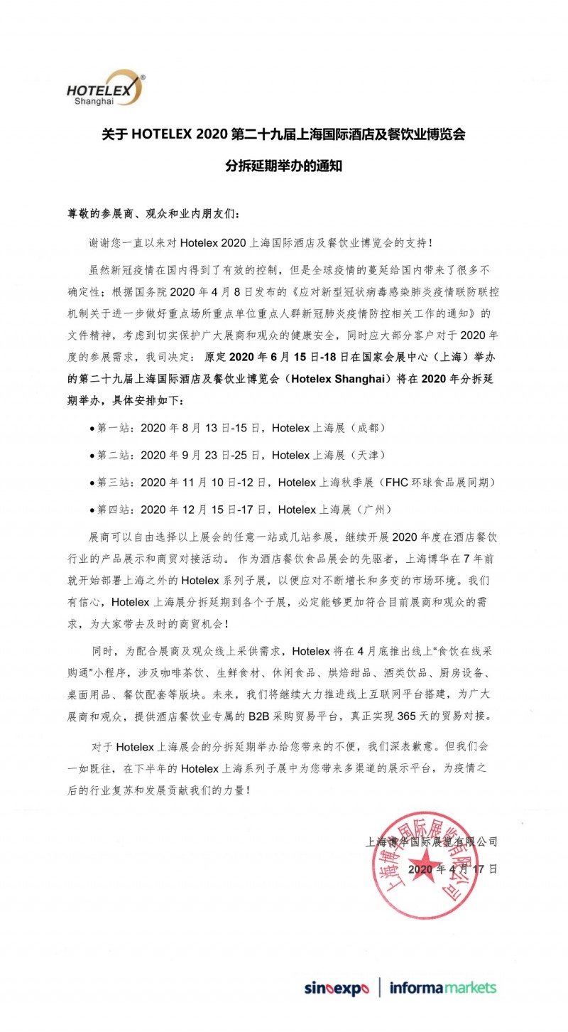 第二十九届上海国际酒店及餐饮业博览会分拆延期通知