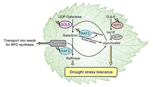 检测结果表明,转ZmRAFS基因拟南芥种子中的棉子糖含量增加,而叶片中的棉子糖含量却降低了。造成这一结果的原因是叶片中合成的蔗糖被运往种子,蔗糖供应不足导致玉米RAFS不能合成棉子糖,而对其另一底物肌醇半乳糖苷进行水解产生肌醇。正是由于叶片中积累的肌醇提高了转基因植物的耐旱性。