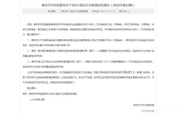 根据南京市市场监管局抽检结果,3批次不合格食品中,一款淮南白蓝企业集团有限公司生产的淮南牛肉汤(方便食品),菌落总数超标。
