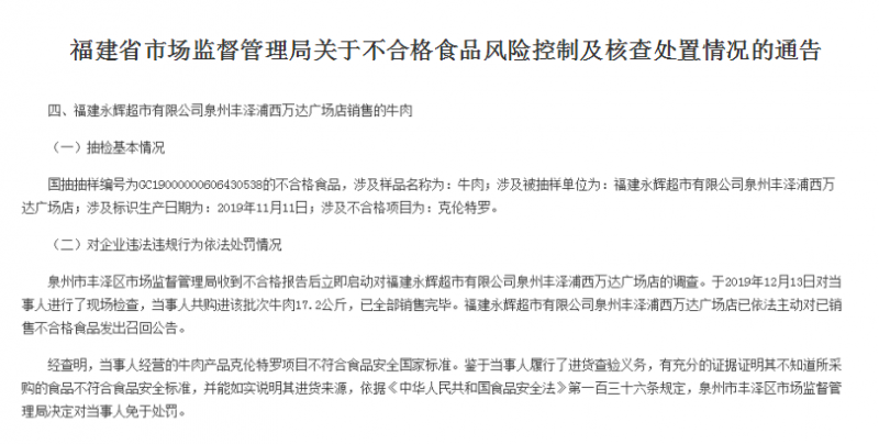 除上述内容外,福建省市场监督管理局网站于6月9日公布的《福建省市场监督管理局关于不合格食品风险控制及核查处置情况的通告》显示,福建永辉超市有限公司泉州丰泽浦西万达广场店销售的牛肉抽查不合格。泉州市丰泽区市场监督管理局于2019年12月13日对福建永辉超市有限公司泉州丰泽浦西万达广场店进行了现场检查,该店共购进该批次牛肉17.2公斤,已全部销售完毕。福建永辉超市有限公司泉州丰泽浦西万达广场店已依法主动对已销售不合格食品发出召回公告。