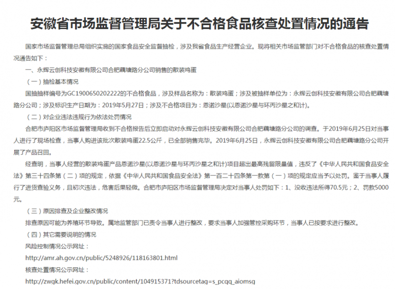 其中,永辉云创科技安徽有限公司合肥藕塘路分公司销售的散装鸡蛋抽查不合格。合肥市庐阳区市场监督管理局于2019年6月25日对永辉云创科技安徽有限公司合肥藕塘路分公司进行了现场检查,该公司购进该批次散装鸡蛋22.5公斤,已全部销售完毕。2019年6月25日,永辉云创科技安徽有限公司合肥藕塘路分公司开展了产品召回。