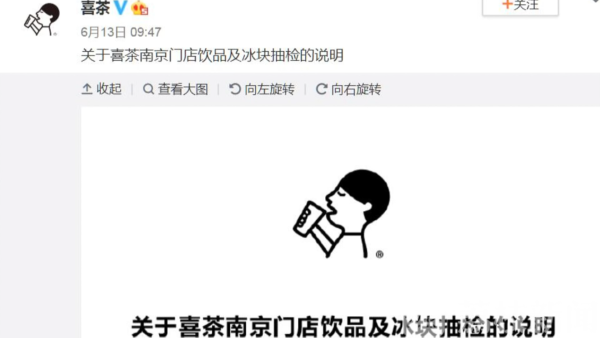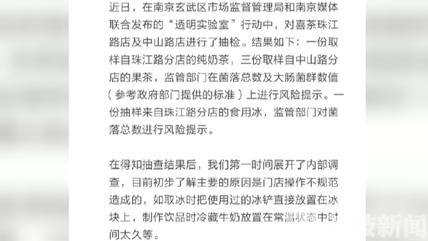 最近,媒体报道了南京市玄武区市场监督部门,抽检了16批次果茶(奶茶) 6批次食用冰,结果发现,知名连锁品牌“喜茶”的一款食用冰,四款现制现售饮料,均检出微生物污染,存在一定食品安全风险。昨天,“喜茶”在官方微博向消费者致歉,表示将会整改。