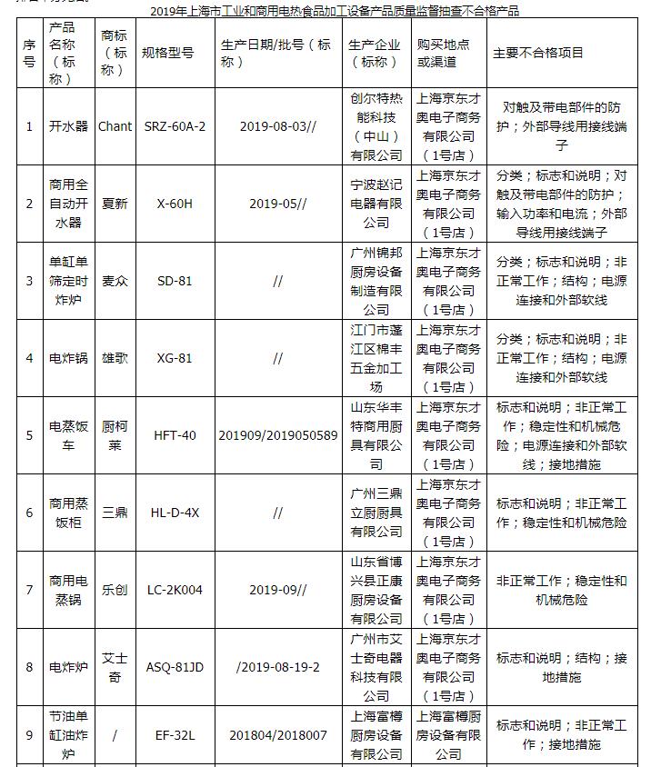 中新经纬客户端6月28日电 上海市市场监督管理局官网28日公布2019年上海市工业和商用电热食品加工设备产品质量监督抽查结果显示,抽查的35批次产品中,不合格14批次。中新经纬客户端注意到,夏新、万家乐等品牌上榜。