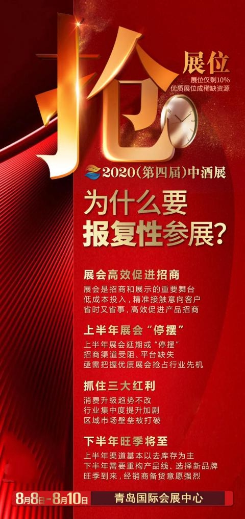 2020中酒展,将于2020年8月8日-10日在青岛国际会展中心盛大开幕,它涵盖了全国范围系列的酒类产品,是行业经销商同仁每年必聚的交流盛会,致力打造全国酒品一站式采购和技术交流平台。