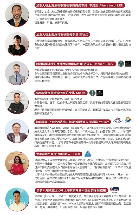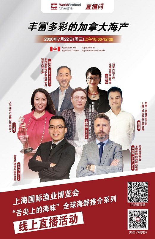 本期上海国际渔业博览会直播间有幸邀请到加拿大驻沪总领事馆领事兼商务专员 Albert J.Lee 李周烈先生及商务专员汪秋红女士,携多家加拿大海产企业一道,开启我们本期“舌尖上的海味”全球海鲜在线推介系列之《丰富多彩的加拿大海产》,推介包含加拿大龙虾、雪蟹、加拿大海参、扇贝、生蚝、 象拔蚌、北极贝、冰山蚌、白玉贝等诸多加拿大特色海产品。