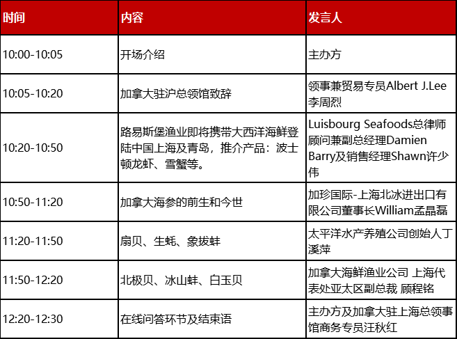 直播内容:推介加拿大龙虾、雪蟹、加拿大海参、扇贝、生蚝、象拔蚌、北极贝、冰山蚌、白玉贝等诸多加拿大特色海产品。