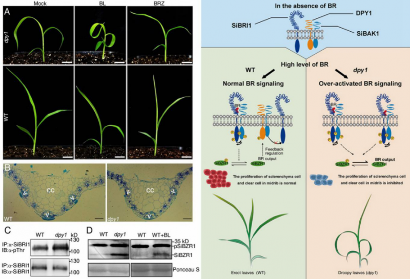 该研究利用谷子叶片严重披垂的突变体 dpy1 ,克隆了控制谷子叶片披垂的基因 DPY1 ,该基因编码的DPY1蛋白激酶可以与油菜素内酯共受体通过胞内的激酶结构互作,并竞争性地抑制油菜素内酯受体与共受体间的互作水平,从而抑制早期油菜素内酯信号的过度激活。 DPY1 作为“刹车”基因,通过以上过程促进细胞伸长和分裂,提高叶片的支撑力,从而使叶片趋向直立,且这种机制在玉米、水稻等禾本科作物中是保守和共享的。该研究揭示了禾谷类作物叶片坚实度的遗传学基础及其调控机制,为作物株型改良提供了新的基因资源及研究思路。同时,谷子及其野生种青狗尾草由于基因组小、高效转化、生育期短,且易于实验室培养操作,正在快速发展成为禾本科黍亚科和C4光合作用的模式植物。该研究必将促进谷子模式植物体系的发展,也巩固了我国在谷子基础研究中的国际领先地位。