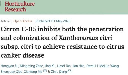 Horticulture Research 在线发表了湖南农业大学园艺学院题为Citron C-05 inhibits both the penetration and colonization of Xanthomonas citri subsp. citri to achieve resistance to citrus canker disease 的研究论文,发现枸橼C-05对柑橘溃疡病菌的入侵和定植均有抑制作用。