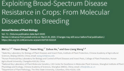 3月20日,湖南农业大学教师李魏博士以第一作者在国际知名年评期刊《Annual Review of Plant Biology》(影响因子18.9)上在线发表题为《Exploiting Broad-Spectrum Disease Resistance in Crops: From Molecular Dissection to Breeding》的综述论文,湖南农业大学植物保护学院为第二单位。