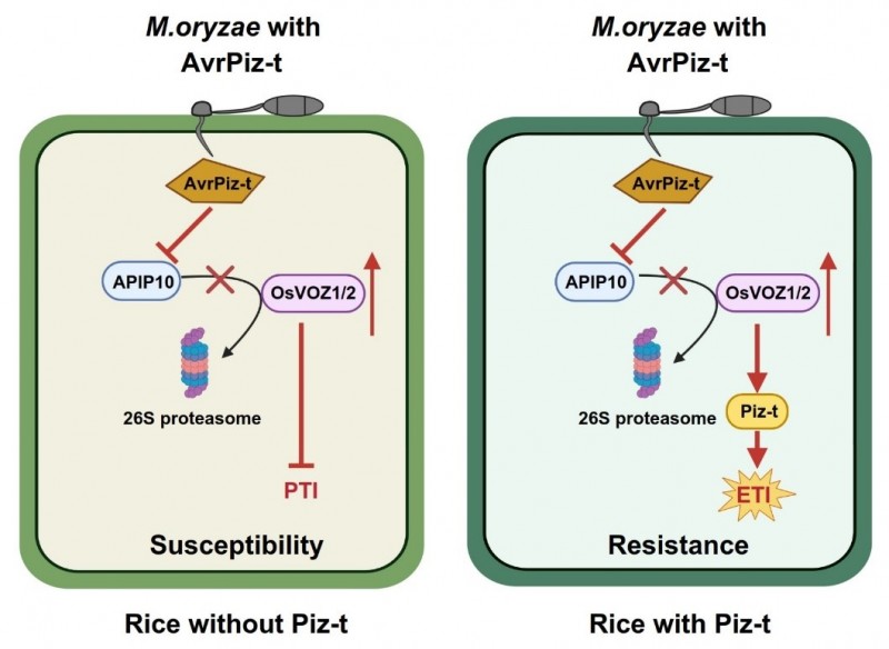 由稻瘟菌( Magnaporthe oryzae )侵染引起的稻瘟病是水稻生产上最严重的真菌病害,鉴定和利用抗病基因是生产上防控稻瘟病最为经济、有效和环保的策略。该团队前期研究先后克隆了稻瘟病广谱抗性基因 Piz-t 及其对应的无毒基因 AvrPiz-t ,并应用于生产实践。进一步研究发现AvrPiz-t通过靶标水稻转录因子APIP5(2016,Current Biology)、E3泛素连接酶APIP6和APIP10(2012,Plant Cell;2015,Molecular Plant;2016,PLoS Pathogens)、钾离子通道蛋白OsAKT1(2018,PLoS Pathogens)和胰蛋白酶抑制剂APIP4(2020,Plant Biotechnology Journal)调控稻瘟菌的致病性和水稻的抗病性。然而,抗病蛋白Piz-t介导的抗病机制以及泛素连接酶APIP10如何促进Piz-t蛋白的降解还不清楚。