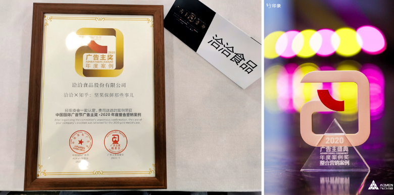 2020年11月16日,第27届中国国际广告节暨广告主盛典在厦门盛大开启,洽洽凭借“洽洽小黄袋X知乎:坚果保鲜那些事儿”斩获中国国际广告节广告主奖·2020年度整合营销案例。