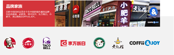 百胜中国同时运营多个在中国的领先餐饮品牌,包括肯德基、必胜客、塔可贝尔、东方既白、小肥羊、黄记煌和COFFii & JOY。这些品牌已经充分融入中国的流行文化与我们顾客的日常生活之中。