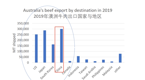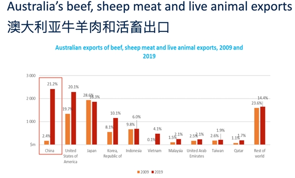 就澳大利亚同期的牲畜出口而言,2019年对中国的出口占澳大利亚牲畜出口总额的比例从7%上升到18%。到2019年底,自2015年中澳自由贸易协定(ChAFTA)出台以来,澳大利亚的农产品出口增长了53%以上。