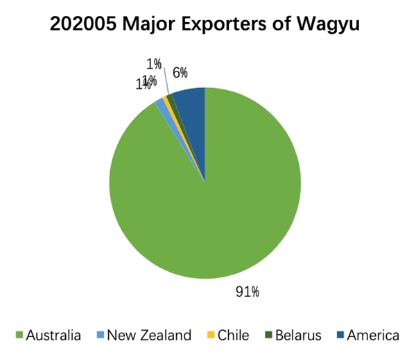 从近几年的月度进口量分布来看,年终之前的澳洲和牛进口量一般处在较高的峰值,春季也会迎来小高峰。2019年起,和牛价格一直走低,但目前日趋平稳。这表示中国买家对于和牛的品质与价格有了更系统的认知。截至2020年5月,澳洲和牛在华的份额持续保持在80%以上,仍然是中国最大的出口国。乌拉圭,新西兰,美国,加拿大占较小份额。