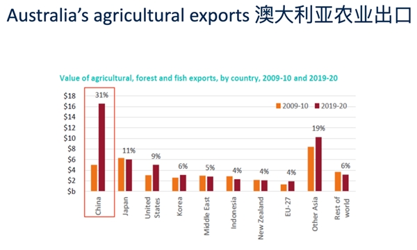 数据显示,中国占据澳大利亚2019-20年农产品出口的近三分之一,相当于160亿澳元以上的出口。这几乎是2009-10年澳大利亚对中国出口的三倍。