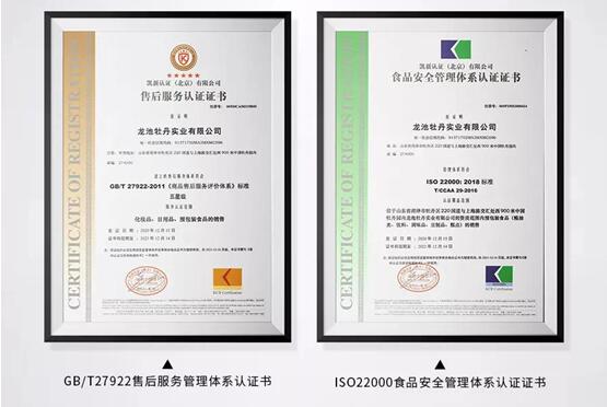 2020年初,龙池牡丹为提升公司整体竞争力,提高产品质量及售后管理质量,积极的引入ISO9001:2008质量管理体系、ISO22000食品安全管理体系、GB/T27922售后服务管理体系,并在产品研发、质量及售后服务等方面认真贯彻和落实。