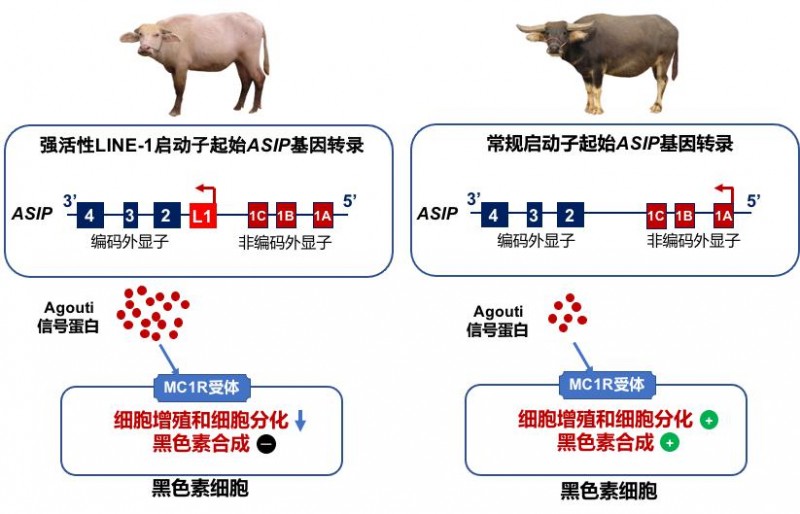 据韩建林教授介绍,白水牛皮肤呈粉红色,眼睛呈现黑色,被毛、角、蹄均为白色,是珍贵的畜禽遗传资源,但其白毛色性状分子机制却一直未被解析。研究人员通过对白水牛Agouti信号蛋白基因( ASIP )研究,发现其上游插入了一个LINE-1转座子,该转座子能显著地提高白水牛皮肤中 ASIP 基因的表达量,进而阻碍了黑色素细胞的发育,最终导致白水牛因皮肤基底层缺乏成熟的黑色素细胞及色素颗粒而呈现白毛色性状。白毛色性状是家养水牛第一个被解析分子遗传机制的表型性状,为我国白水牛特色遗传资源的有效保护和科学选育提供了重要科学依据。