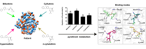 该研究通过蛋白质三维结构模建、蛋白质-药物分子对接、蛋白质-药物复合物分子动力学模拟等现代药物设计技术并联合分子生物学定点突变试验,阐明了小菜蛾羧酸酯酶(PxEst-6)代谢4种拟除虫菊酯(Bifenthrin、Cyfluthrin、Cypermethrin、λ-cyhalothrin)的分子机理;证实了PxEst-6具有参与小菜蛾对拟除虫菊酯解毒代谢过程的能力;分析了拟除虫菊酯与PxEst-6的结合模式,揭示了参与代谢的关键氨基酸残基和作用方式;发现PxEst-6通过Q431、H451和K458残基与拟除虫菊酯的乙酸酯基团发生极性或氢键相互作用从而对其进行代谢。该研究揭示了PxEst-6代谢拟除虫菊酯杀虫剂的分子机理,为探索小菜蛾对拟除虫菊酯杀虫剂的抗药性提供了理论依据,为研发新型拟除虫菊酯杀虫剂提供了新的方向。