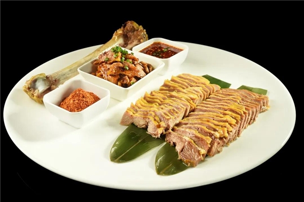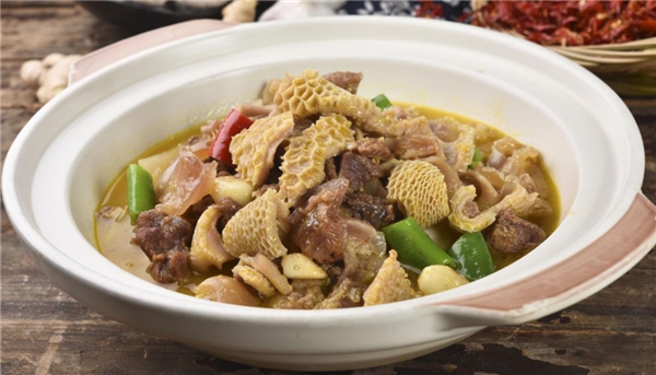 其主料是牛肚、牛蹄、牛肉,肉片大块,真材实料,肉质爽口鲜嫩,口感很鲜美,其中的金汤是食掌柜首创独门秘制产品,汤汁采用的是台湾黄椒和海南金黄瓜熬制而成的秘制酱,口感上香醇浓郁,沁人脾胃。