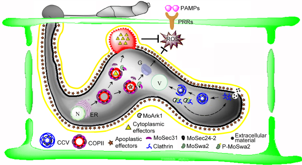 近日,南京农业大学植物保护学院张正光课题组在New Phytologist发表题为“Auxilin-like protein MoSwa2 promotes effector secretion and virulence as a clathrin uncoating factor in the rice blast fungus Magnaporthe oryzae”的研究论文。报道了稻瘟病菌辅助因子MoSwa2调控COPII囊泡的解聚,介导效应子的外泌,进而抑制寄主活性氧的迸发,促进稻瘟病菌在水稻中的成功定殖。该研究揭示了囊泡运输调控效应子胞内转运的机制。