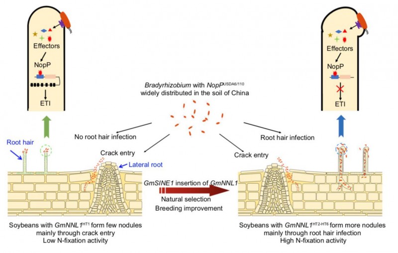 2021年1月15日,河南大学王学路教授团队和华中农业大学李友国教授合作在Nature Plants上发表了题为“Glycine max NNL1 restricts symbiotic compatibility with bradyrhizobia via root hair infection in soybean”的研究论文(doi : 10.1038/s41477-020-00832-7),揭示了大豆与根瘤菌共进化过程中根瘤菌由裂隙侵染向根毛侵染方式转变的遗传、分子和进化机制。研究人员首先构建了来自于世界各地的496份大豆核心种质自然变异群体;再根据接种慢生型根瘤菌后根瘤数目的表型,进一步通过全基因组关联分析结合遗传分析和分子生物学的方法,定位并证明了一个编码TIR-NBS-LRR蛋白的R基因(命名为GmNNL1,Nodule Number Locus 1)能够限制根瘤菌侵染大豆,降低大豆的根瘤数目。进一步分析发现,在大豆的自然选择、人工驯化以及与根瘤菌的共进化过程中,一类GmSINE1转座子的插入导致了该基因功能失活,使其只能编码截短形式的GmNNL1蛋白,从而促进了大豆对土壤中土著根瘤菌的识别,增加了大豆根瘤数量,进而显著提高了大豆单株固氮酶活以及地上部分生物量。GmNNL1主要在根毛中受根瘤菌诱导表达并主要影响根瘤菌的根毛侵染途径,而具有转座子插入的GmNNL1失活单倍型的出现,是导致根瘤菌侵染大豆由裂缝侵染向根毛侵染转变的重要原因。进一步通过质谱鉴定、生化和遗传分析发现,全长的GmNNL1蛋白通过与根瘤菌的三型分泌系统效应蛋白NopP直接相互作用激活ETI从而抑制大豆与根瘤菌的共生。该研究不仅揭示了大豆与根瘤菌互作过程中宿主与寄主匹配性的遗传和分子机制,还阐释了根瘤菌与大豆共进化过程中根瘤菌由裂缝侵染演化成高效的根毛侵染过程的重大分子事件,也为大豆高效固氮的分子设计育种提供了重要理论依据和目标基因。