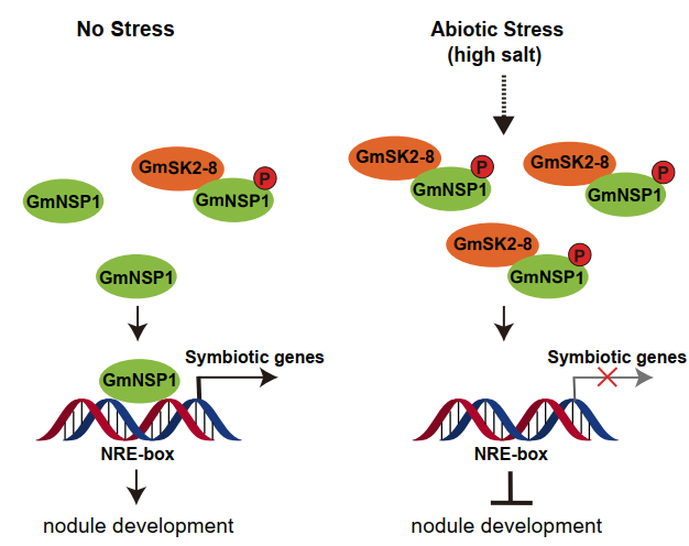 2020年12月21日,王学路教授团队在Molecular Plant上发表了题为“GSK3-Mediated Stress Signaling Inhibits Legume–Rhizobium Symbiosis by Phosphorylating GmNSP1 in Soybean”的研究论文(doi:10.1016/j.molp.2020.12.015),揭示了大豆中GSK3蛋白激酶磷酸化共生关键转录因子NSP1,从而介导盐胁迫抑制豆科植物-根瘤菌共生的分子机制。该研究首次揭示了糖原合成酶激酶3(glycogen synthase kinase 3, GSK3)家族基因在盐胁迫抑制大豆共生信号和根瘤形成过程中起重要作用。研究结果表明,大豆GSK3家族第二亚家族的GmSK2-8的表达受高盐胁迫和接种根瘤菌诱导并能负调控早期根瘤菌侵染、根瘤原基发育和共生响应基因的表达,从而调控大豆根瘤形成。质谱和生化分析证实GmSK2-8能与共生信号途径中的关键转录因子GmNSP1相互作用,并通过磷酸化GmNSP1从而抑制共生基因的表达。遗传分析证明,盐胁迫是可以通过GSK2-8-NSP1调控根瘤形成。该研究揭示了盐胁迫调控豆科植物结瘤固氮的分子机制,为改善大豆等豆科植物在非生物逆境胁迫条件下的共生固氮、提高固氮效率有重要应用前景。